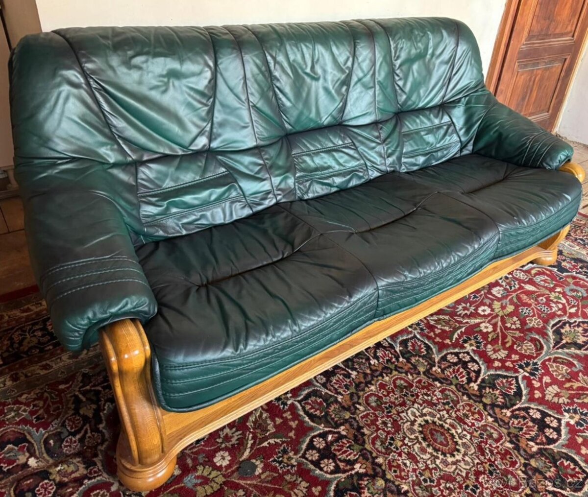 Nabízím k prodeji rustikální koženou sedačku - trojsedák v tmavě zelené barvě.