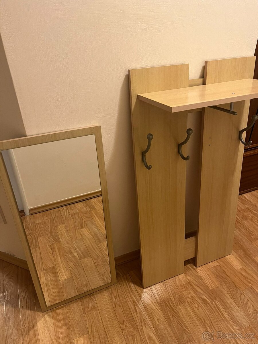 Prodám věšákovou stěnu se zrcadlem. Rozměry zrcadla: 36x82, rozměry věšáku 54x101