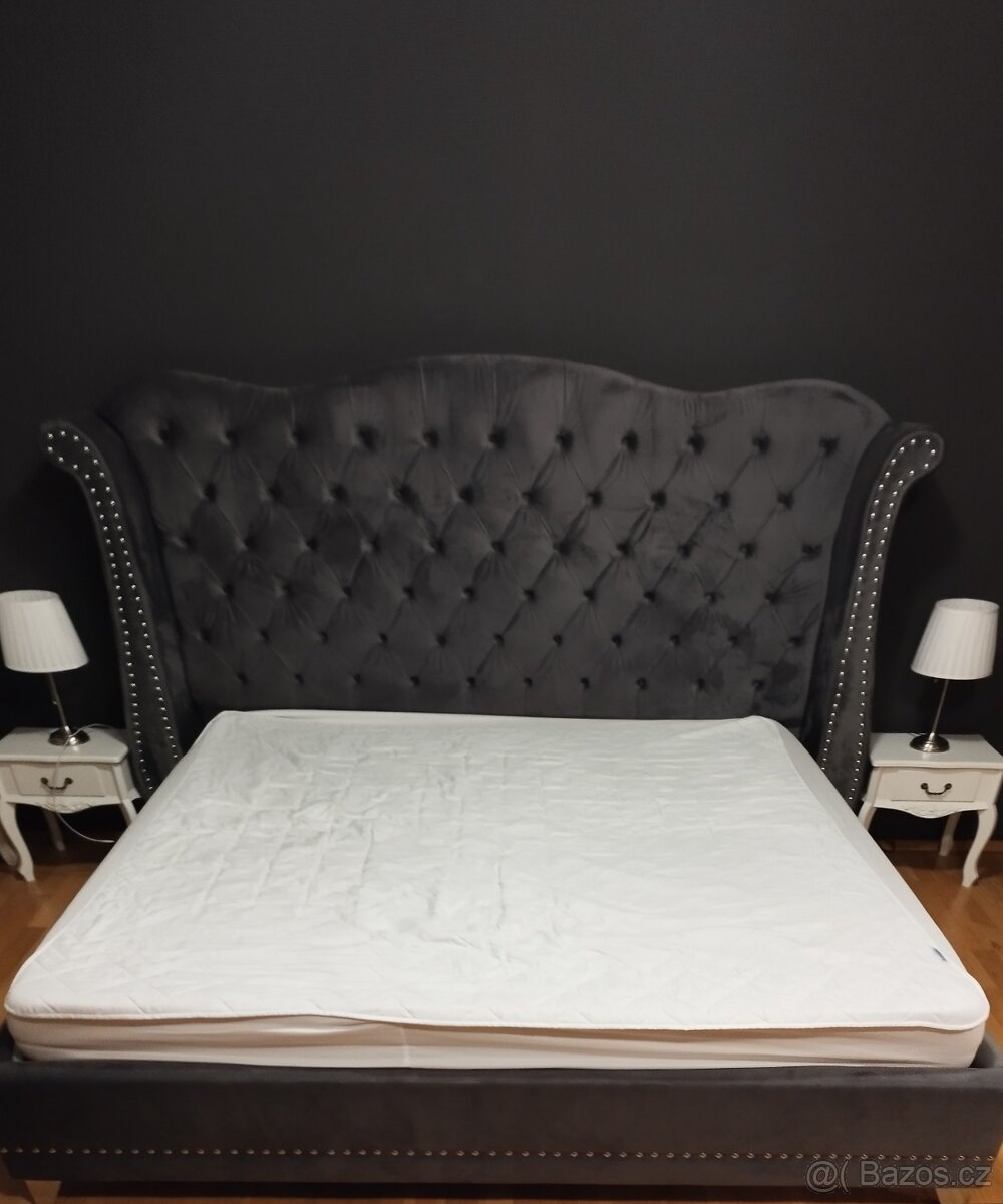 Prodám postel s rozměry 180x200 bez stolků a lampiček, které jsou na fotce. Postel tedy prodávám včetně roštu a matrace, která nemá původní obal a není tedy zohledněna v ceně. Materiál umělý samet.