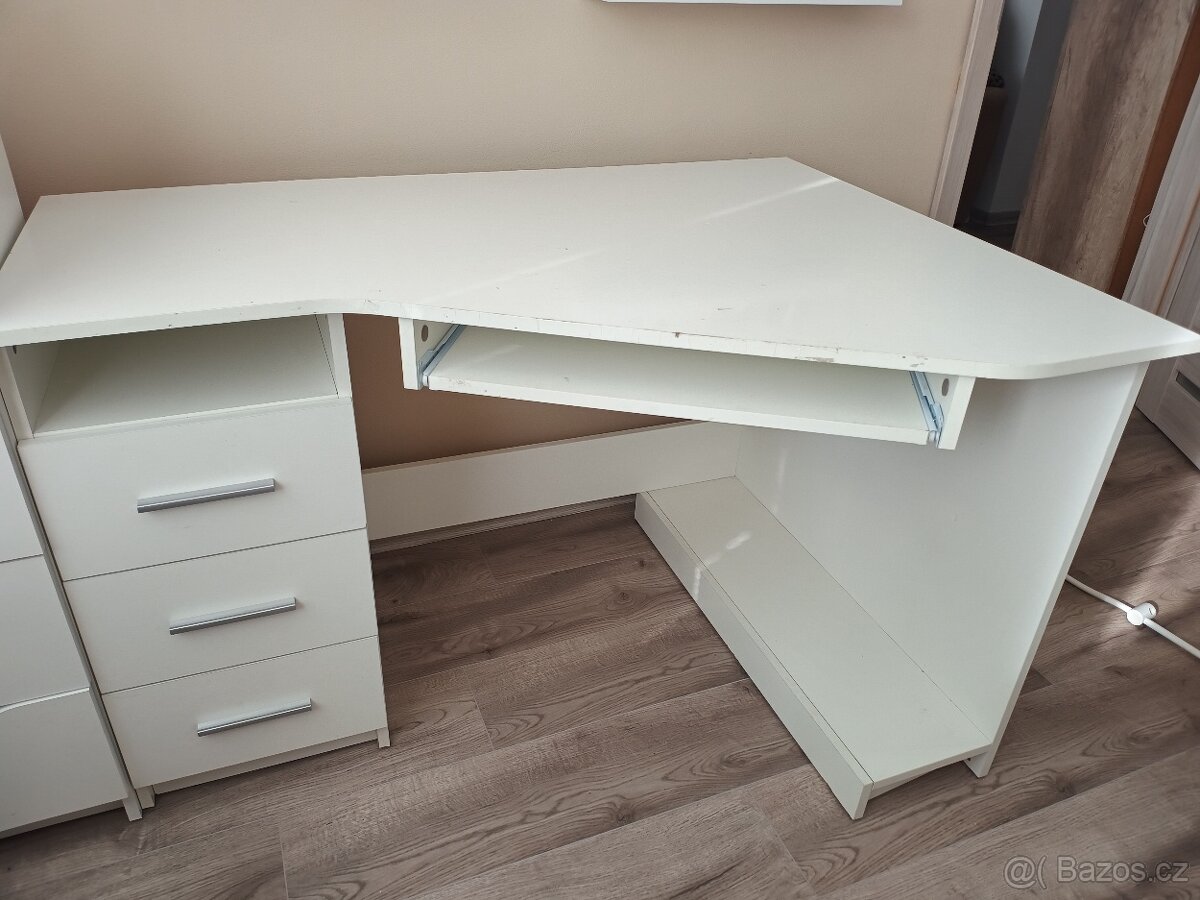 Prodám rohový psací stůl. Šiřka 120cm, šířka 85/50cm/ výška 76cm, 3x šuplík 35x16cm.