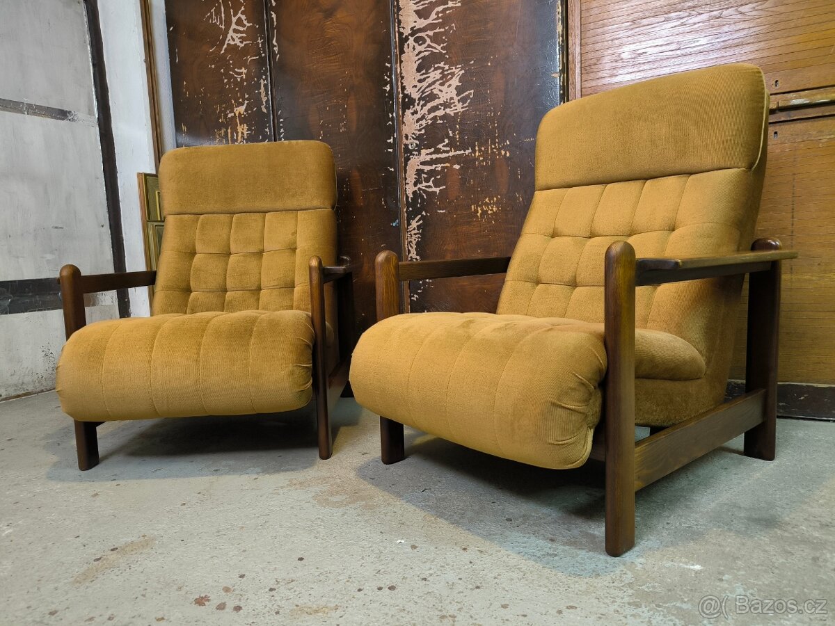 Prodám masivní párová křesla ze soupravy Barbora vyrobená z masivního bukového dřeva v kombinaci se semišovým potahem hořčicové barvy. Křesla jsou v krásném zachovalém stavu, konstrukčně naprosto v pořádku, čalounění nepoškozené a čisté, dřevěné části velice zachovalé. Rozměry: 77 x 83 x 101 cm (Š x H x V). Cena uvedena za obě křesla.