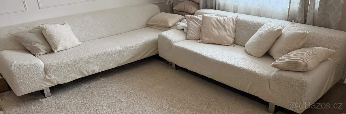 Sedací souprava se skládá ze dvou pohovek a jednoho taburetu. Větší pohovka má rozměr 240x100cm. Menší pohovka má rozměr 200x100cm. Taburet má rozměr 130x60cm. Barva béžová/šedá. Přidám i světlý beránkový potah.