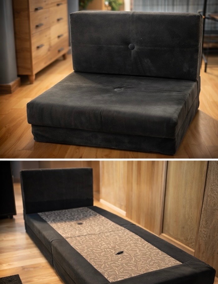 Používané. Křeslo lze rozložit pro občasné spaní návštěv. Rozměr po rozložení 75 cm x 190 cm.