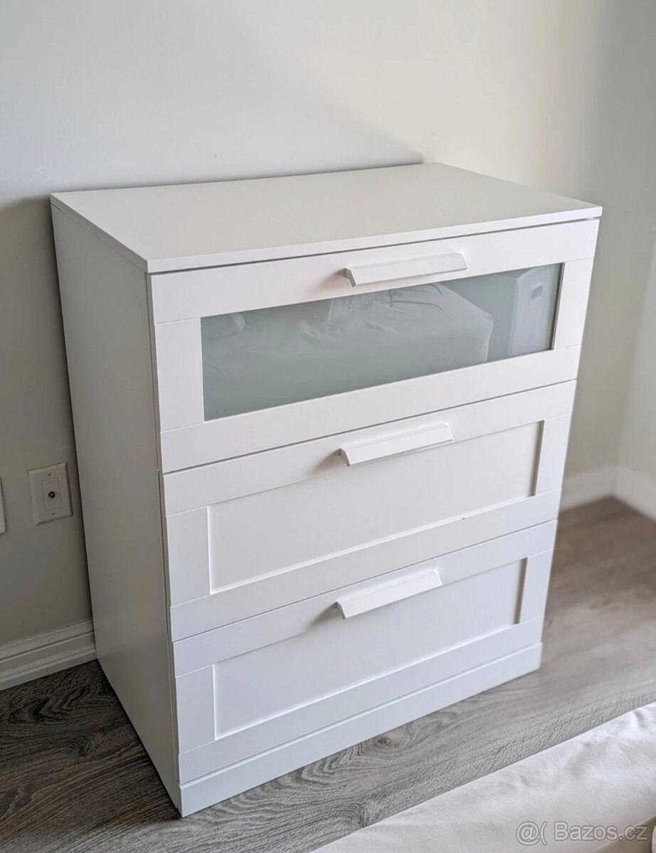 Prodám komodu IKEA BRIMNES se 3 zásuvkami, bílá/mléčné sklo v perfektním stavu, jako nova. Mám dvě stejné komody. Rozměry: šířka: 78cm, hloubka: 46cm, výška: 95cm. Je možnost dokoupit bílou šatní skříň a postel. Podívejte se na mé další inzeráty. K vyzvednutí Rostoklaty, vedle Uval. Můžeme se domluvit i na dopravě po Praze a okolí.