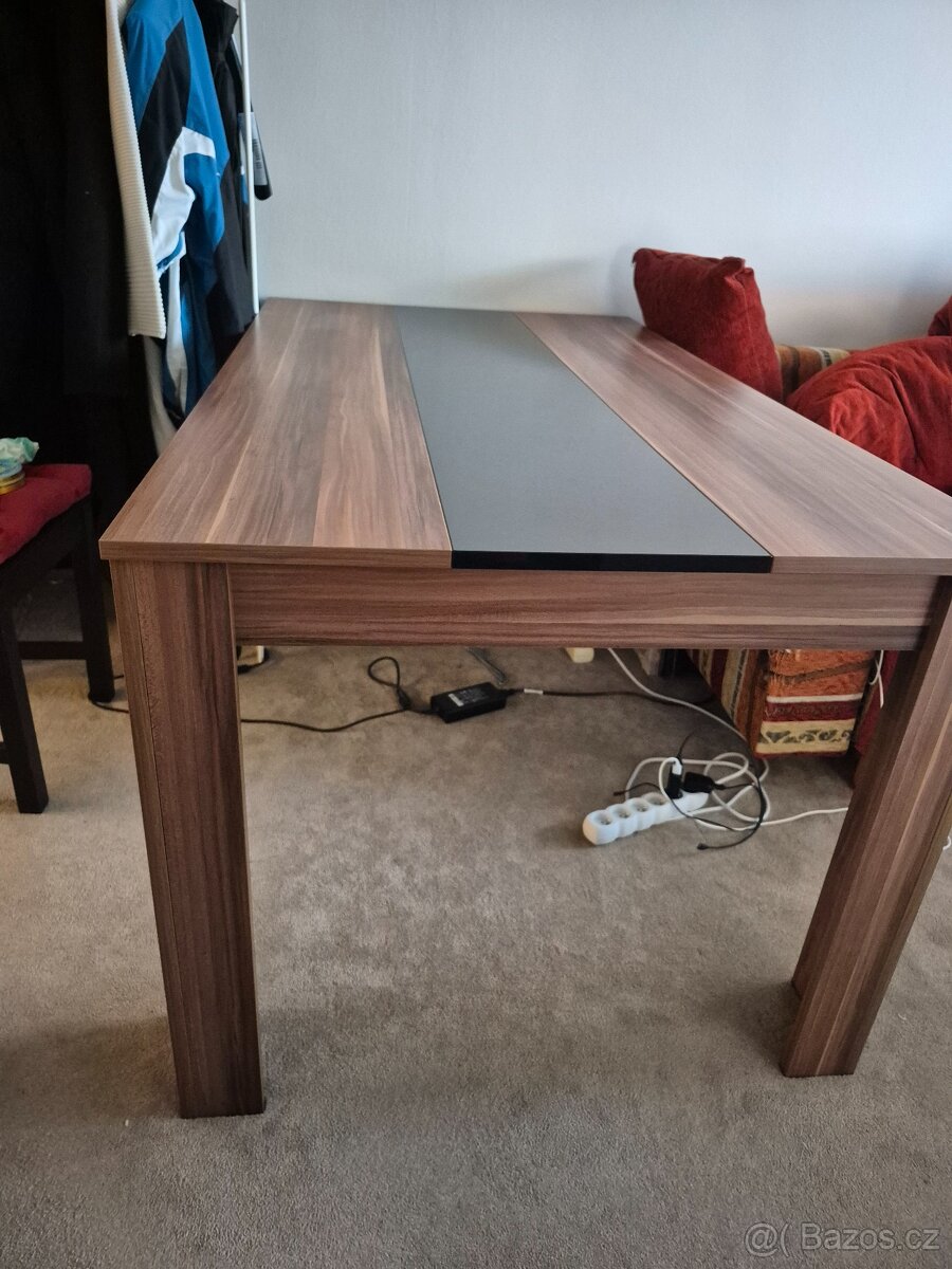 Jídelní set - [28.2. 2026]tmavý jídelní stůl (lamino / dýha, běžný prodejní model)- rozměry delka150 cm,šířka 85 cm výška 75 cm, židle