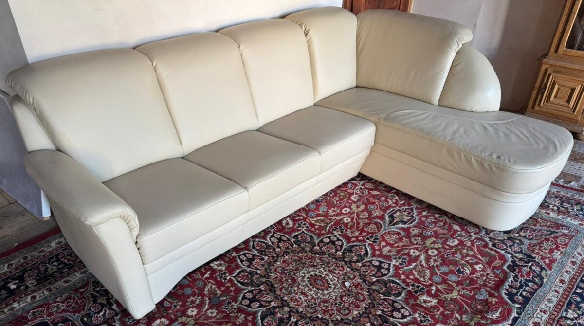 Nabízím k prodeji krémovou koženou rohovou sedačku s úložným prostorem.