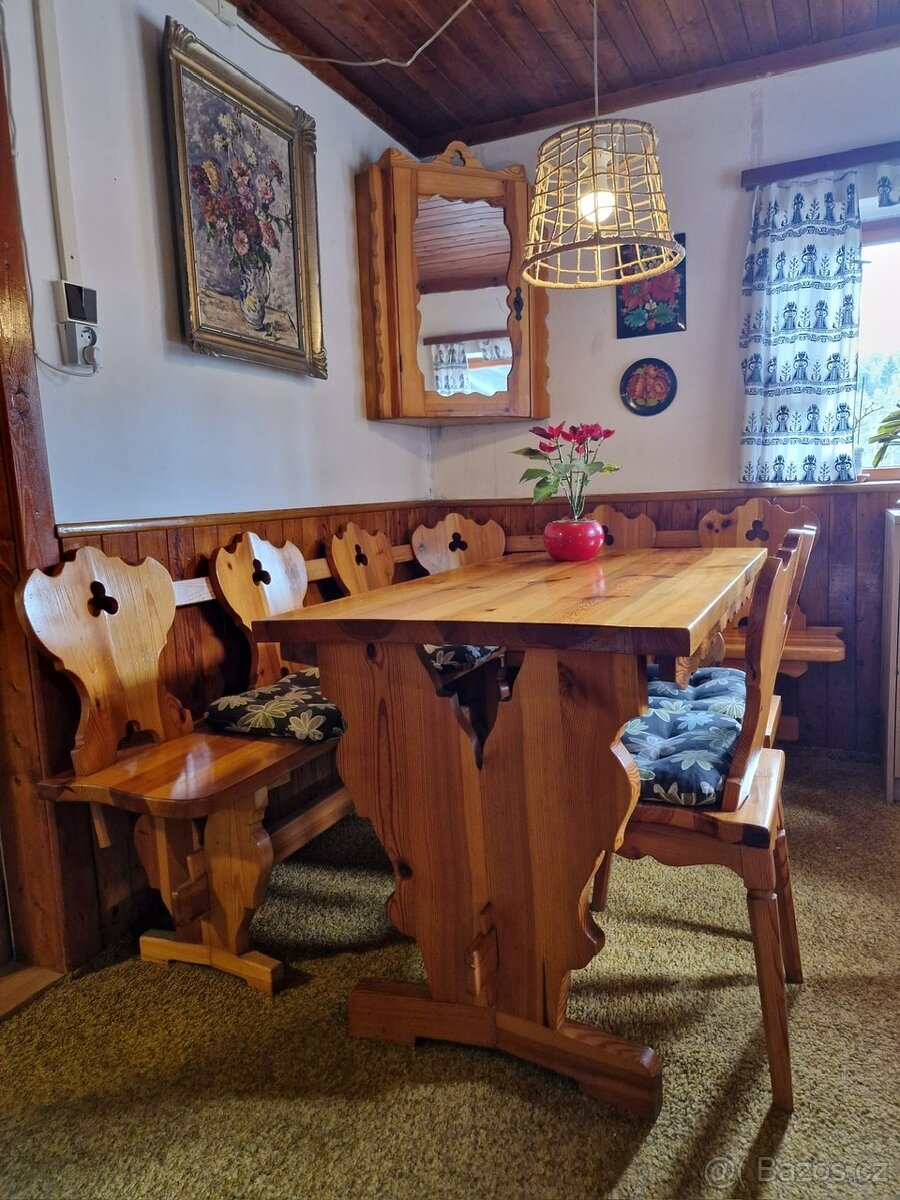 Jidelní kout + komoda masiv jasan - [22.2. 2026]Bytelný selský nábytek z Krásné jizby. Stůl, lavice s úložným prostorem, 4 židle, velký příborník - komoda. Používaný, funkčně v pořádku.