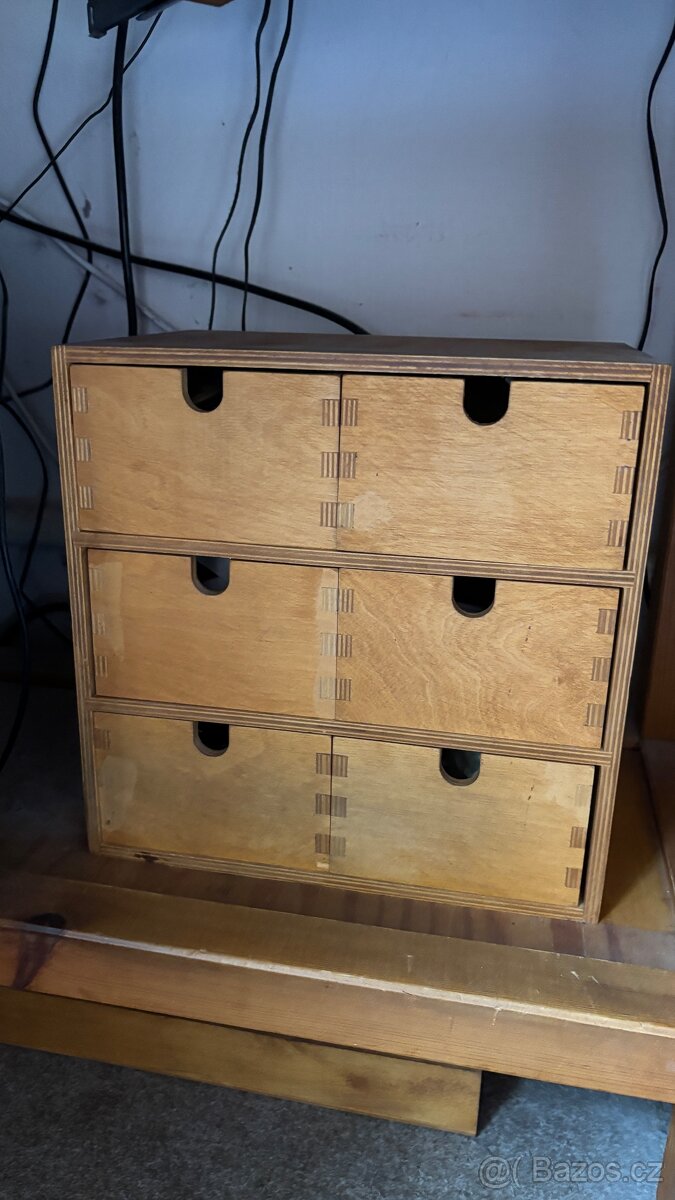 Dřevěný box se šuplíčky, rozměry viz foto. Vhodné na drobnosti, kancelářské potřeby apod.