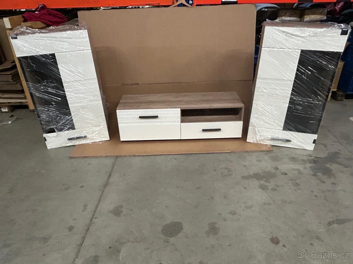 Prodám moderní TV stěnu v kombinaci bílá / dekor dub. Sestava obsahuje TV stolek a dvě vysoké vitríny s LED osvětlením.