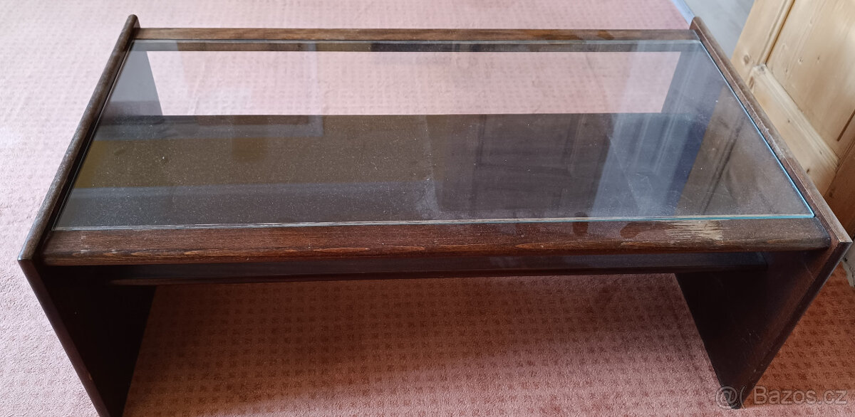 Dva konf. stolky 1/ prosklený, dřevěné desky, hnědý za symbolickou cenu 200,-Kč
