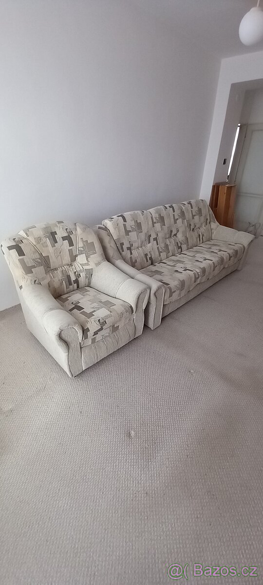 Prodám velmi pěknou,nezničenou sedací soupravu velikosti 3+1+1. Trojitá sedací souprava je polohovatelná do lůžka s úložným prostorem. Původní cena 19.500,-Kč,nyní s velkou slevou za 7.900,-Kč. Tel.:604 956 180,Znojmo