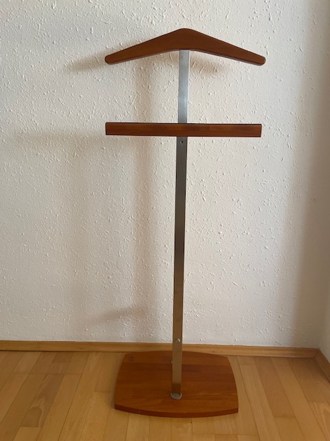 Nový, pouze smontovaný originální stojan na oděvy, vyrobený z bukového dřeva a nerezové oceli. Dřevo je ošetřené matným lakem, spodní ramínko je opatřené protiskluzovým páskem. Mohu zaslat v demontovaném stavu se všemi komponenty. Výška 110 cm, šířka 45 cm a hloubka 29 cm.