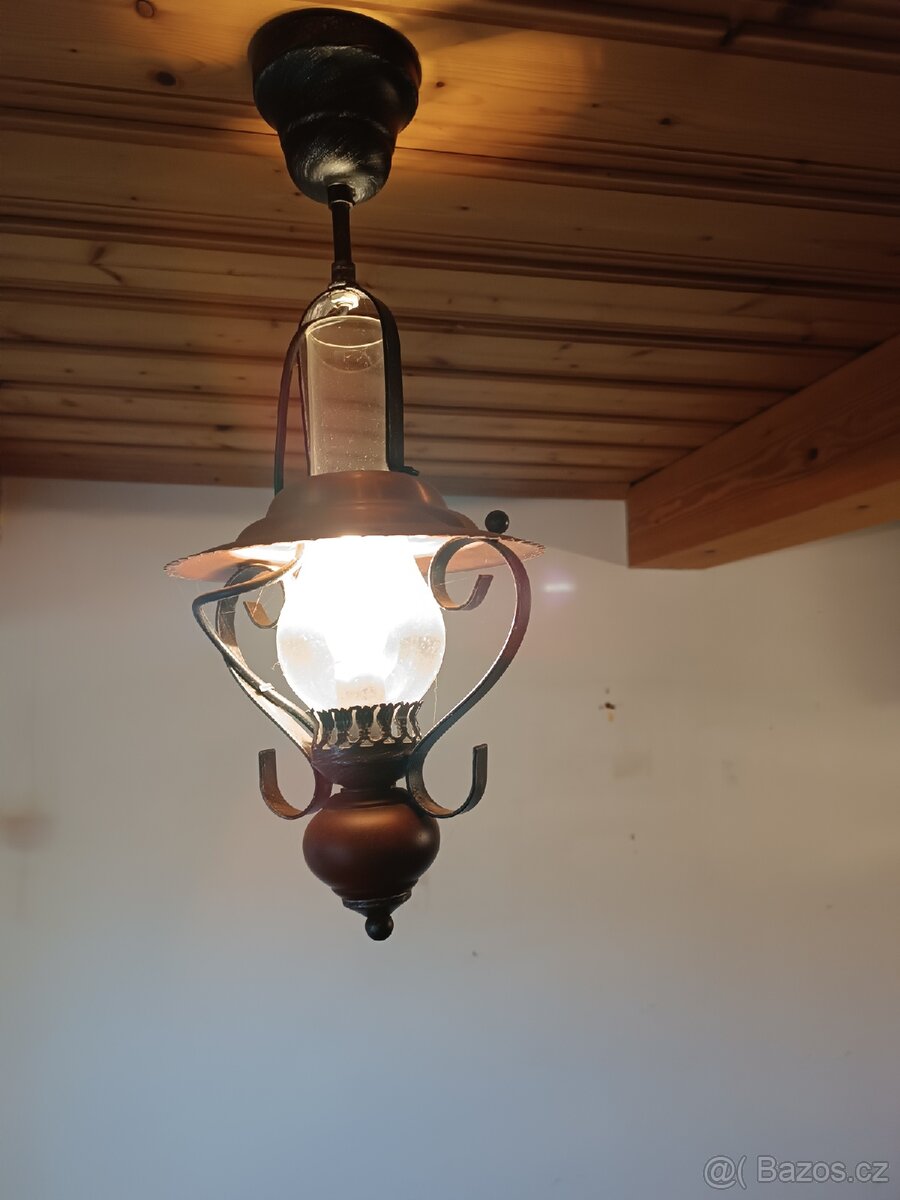 Dřevo, sklo, kov. Mám 4ks, cena za 1ks. Ještě mám lampičky a jeden větší lustr ve stejném stylu.
