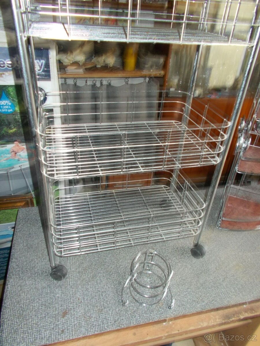 Prodám kovový, koupelnový vozík a držák na fén. Výška vozíku 78 cm, šířka 45 cm. Cena za vše 200 Kč. Jen osobní odběr.