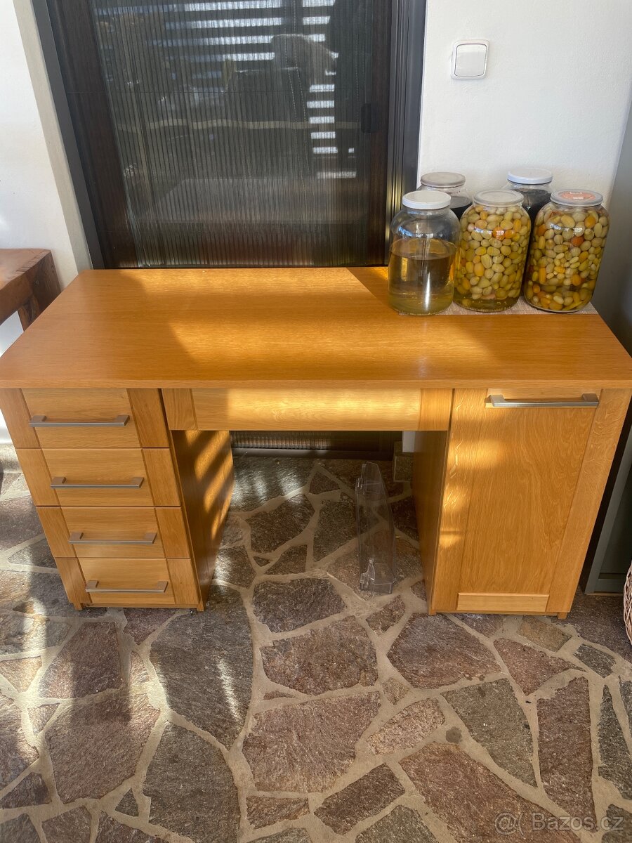 Světlý psací stůl kombinace masiv dub/ dýha s plechovými kvalitními šuplíky ve velmi dobrém stavu o rozměru 130cm/ 60 cm. Cena 2500,-