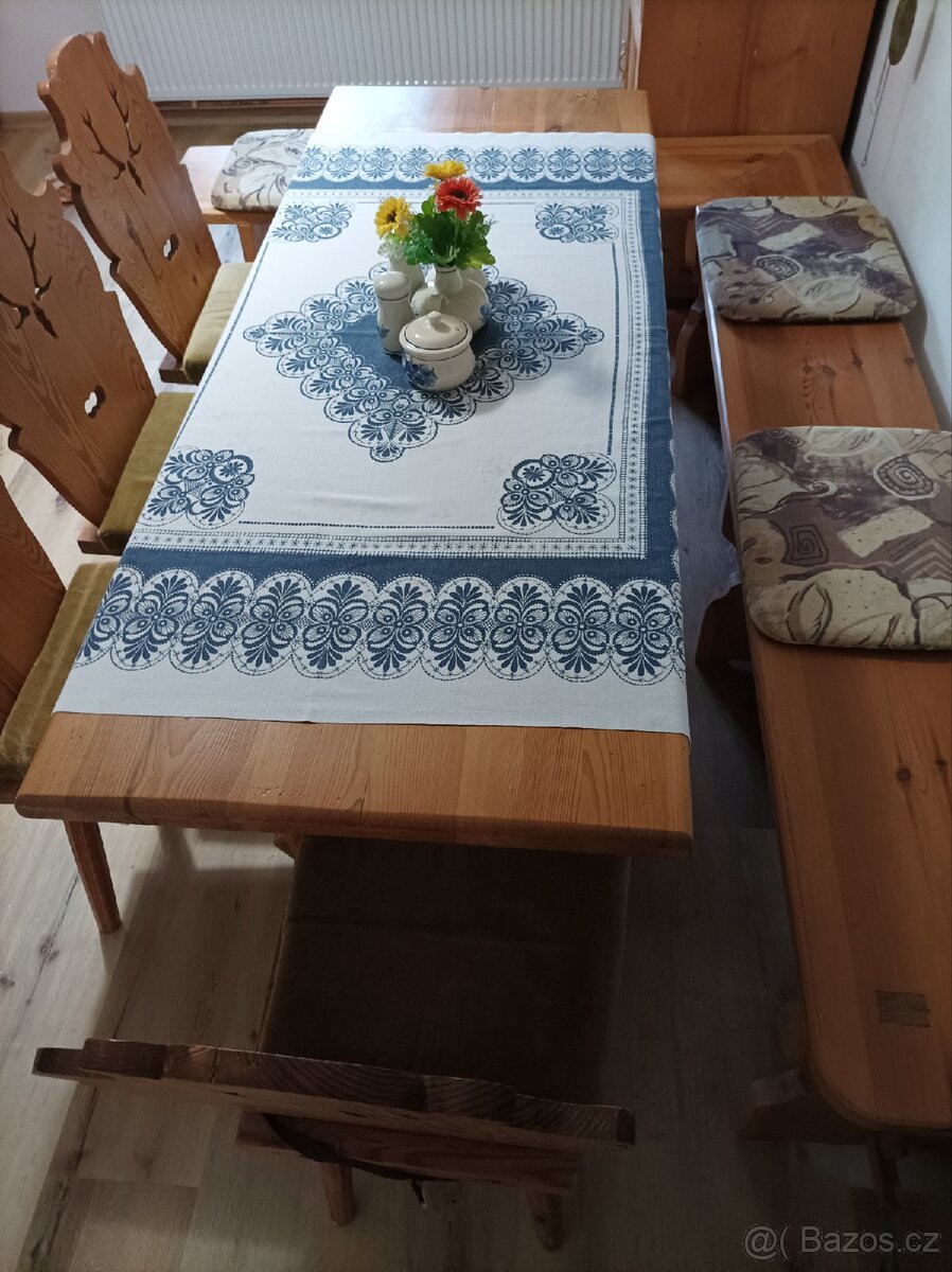 Prodám jídelní set z masivni borovice v pěkném stavu, motiv jelení hlavy, vhodné pro myslivce, rozměry na fotce. K vyzvednutí u Suchdola nad Lužnicí.