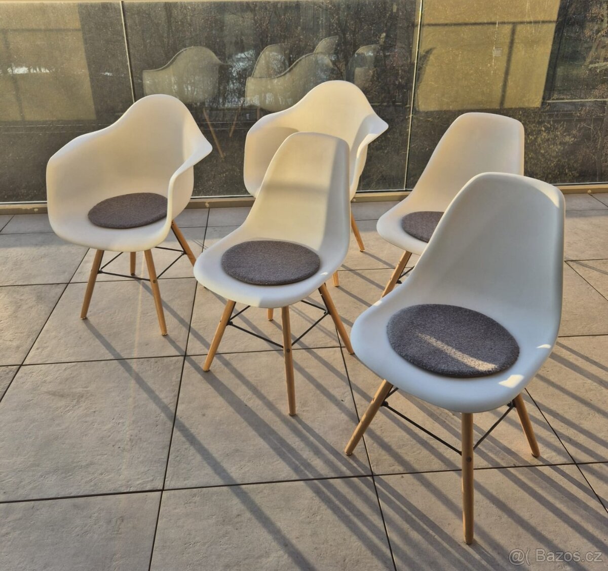 Židle jsou nepoškozené. Tři židle bez područek a dvě s područkami. Cena včetně podsedáků. K odběru ihned.