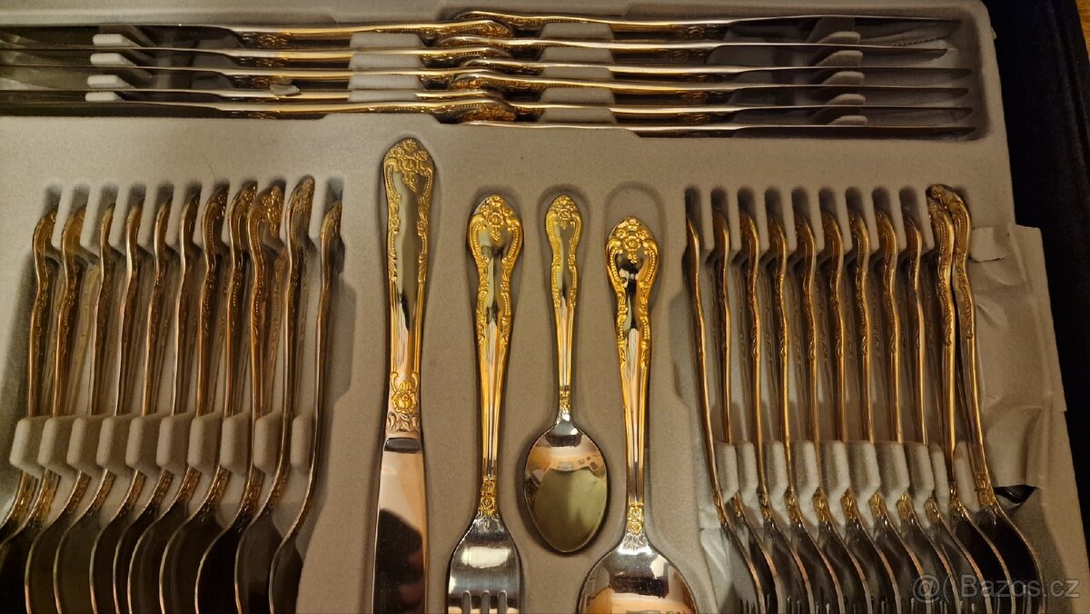 Nová, nepoužitá sada zdobených příborů v kufru.