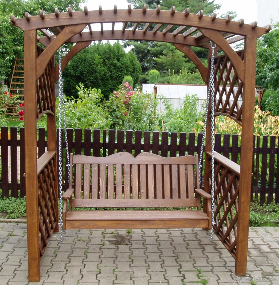 Zahradní pergola s houpačkou, š. lavice 130 cm, h. sedáku 45 cm, v. opěradla 60 cm, š. pergoly 170/200 cm, v. pergoly 210 cm, h. pergoly 120 cm