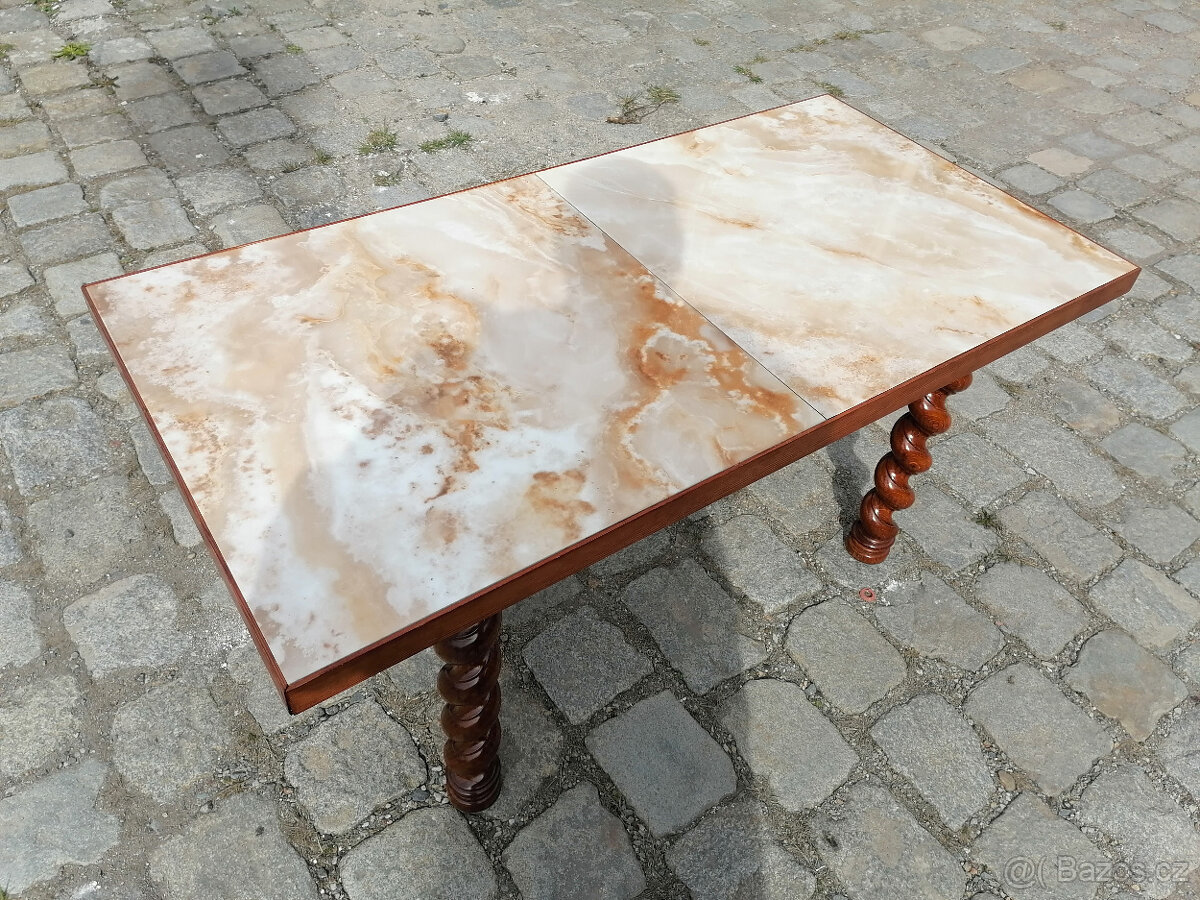 Prodám masivní těžký stůl, viz fotografie. Rám ze starožitného stolu doplněný o imitaci mramoru a odkládací prostor na časopisy. Krásný stav a kvalitní práce - žádná Čína, Polsko nebo papír z Ikea. Vhodné jako moderna i ke starožitnému.
