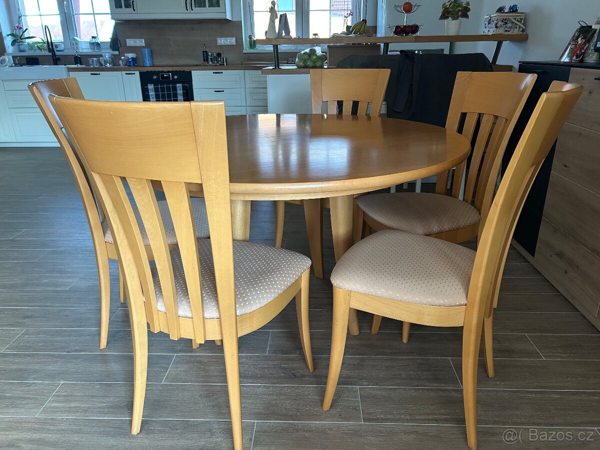 Prodám kulatý jídelní stůl spolu s pěti židlemi. Stůl je ve velmi dobrém stavu, deska místy možná mírně poškrábaná. Židle bez závad. Průměr stolu je cca 132cm a na výšku měří 76cm.