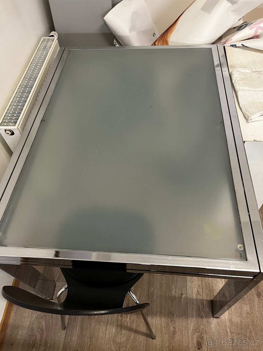 - jídelní stůl z hliníkové konstrukce pro 4 lidi, mléčné tvrzené sklo, možnost dovést Liberec, Frýdlant a okolí.