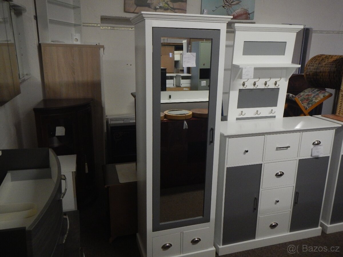 Předsíňová skříň se zrcadlem. Výška 180cm, šířka 60cm, hloubka 40cm. Materiál lamino. Nábytek je nový v původním obalu v demontu. Máme více kusů.