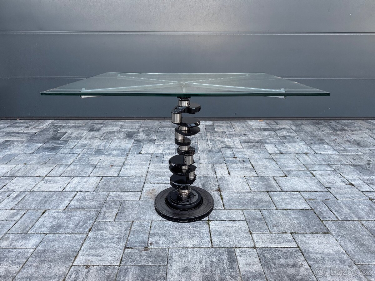Prodám stolek vlastní výroby. Vyrobený z klikové hřídele V8 Chevy 5,7l a brzdového kotouče. Klika krom kluzných částí je lakována do černé barvy , stejně tak část kotouče. A celá konstrukce je zalakovaná do bezbarvého laku. Rozměry skla 100x80cm kalené o tloušťce 1cm. Stůl je vysoký 72cm.