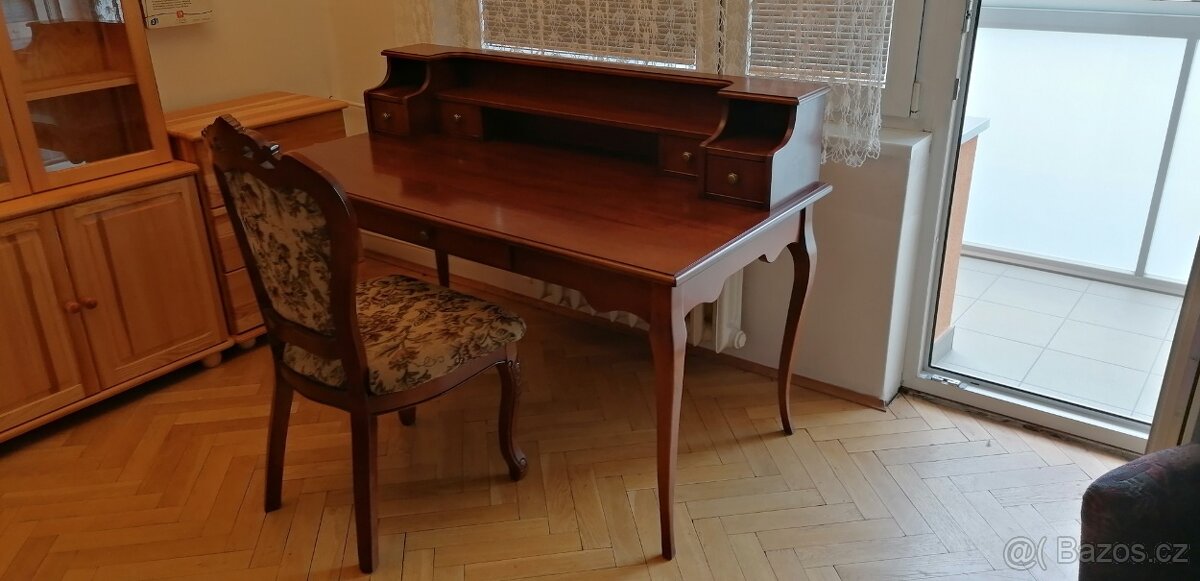 Prodám psací stůl s nadstavbou vyrobený na zakázku ve skvělém stavu. Dýha z ořechového dřeva, mořeno ořech. Šířka 150 cm, výška 75 cm (pracovní plocha), hloubka 75 cm. Výška s nadstavbou 100 cm. Všechny zásuvky funkční, pevný, stabilní.