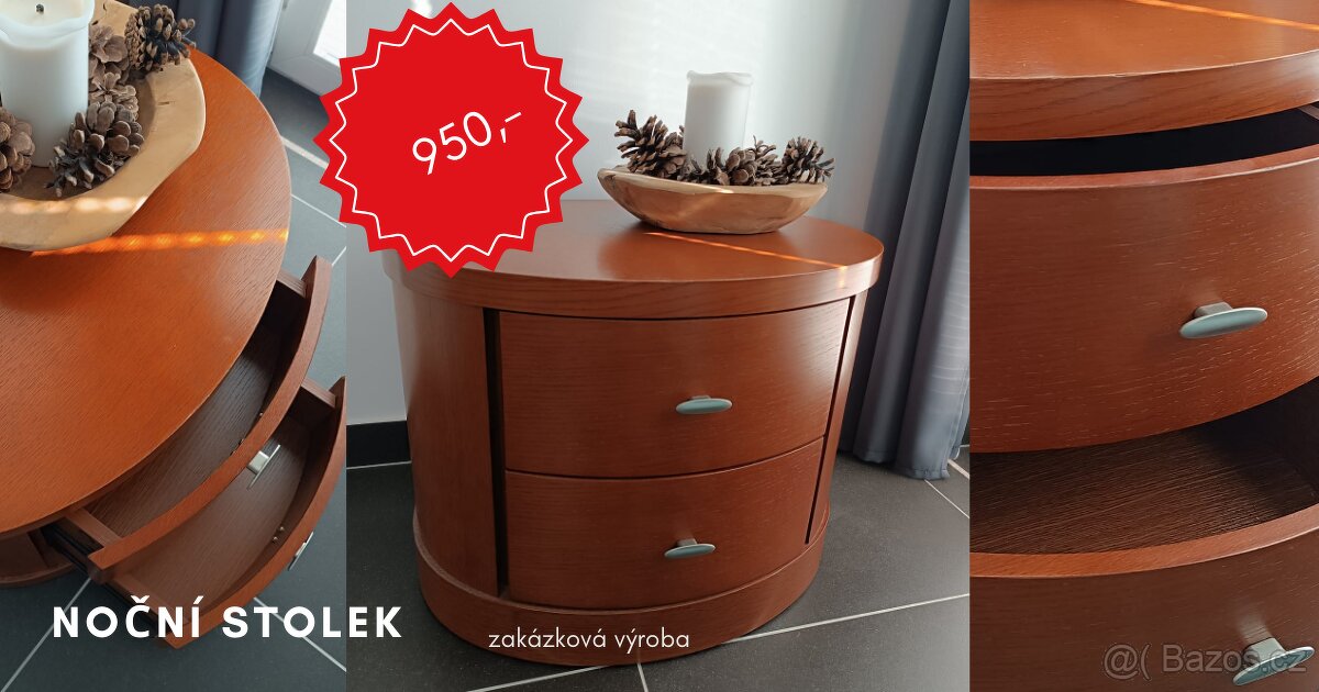 Prodám unikátní oválný noční stolek, který byl vyroben na zakázku jako poctivý, bytelný kus nábytku. Stolek je v bezvadném stavu, velmi zachovalý a bez poškození.