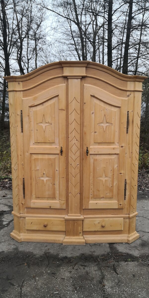 Prodám velmi pěknou celomasivní policovou skříň s masivním kováním + 2x šuplík. Rozměry: šířka-150cm,hloubka-55cm,výška-187cm. Skříň lze na převoz rozdělat na dva díly. Více pěkného masivního rustikálního nábytku najdete - leerinabytek.