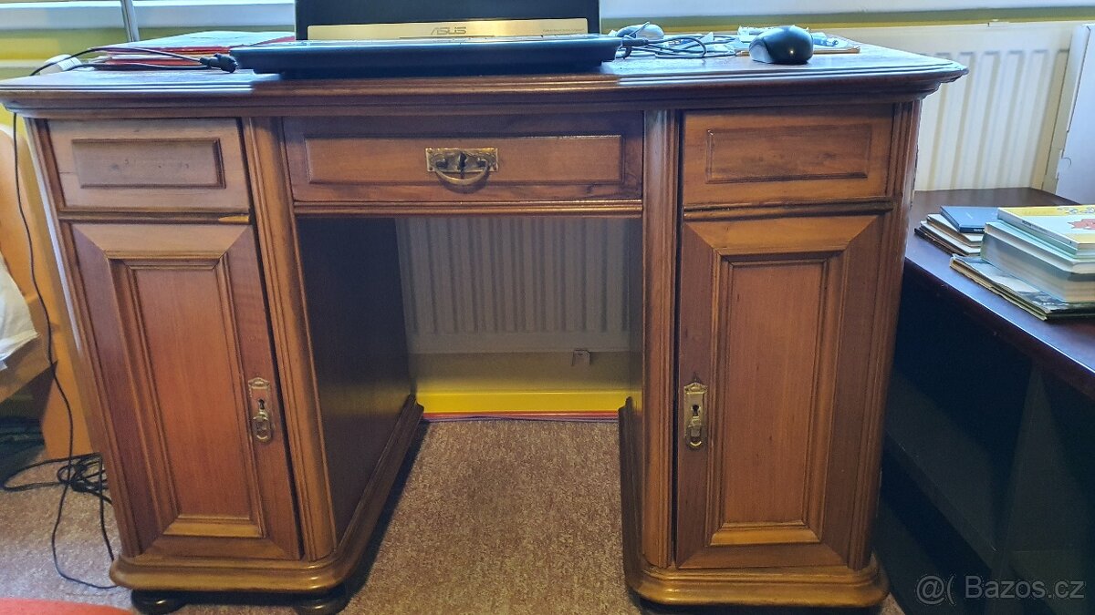 Prodám psací stůl citlivě zrestaurovaný z masivního dřeva s uzamykatelnou zásuvkou a uzamykatelnými dvířky.