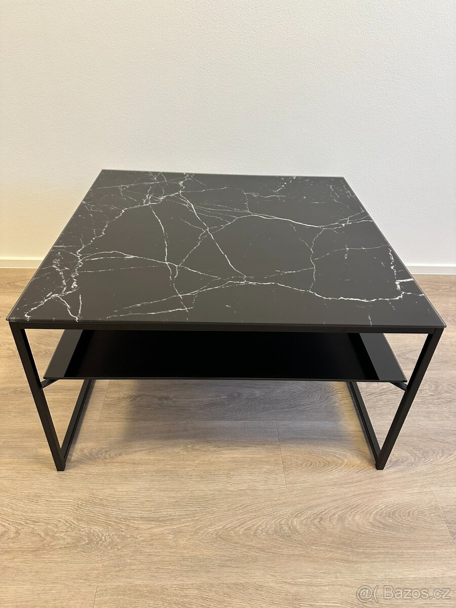 Prodám černý konferenčný stolek s dekorem mramoru na povrchu - vrchní deska z průhledného mléčného skla, které se neškrábe a je velice praktické. Spodní deska je skleněná lesklá černá.