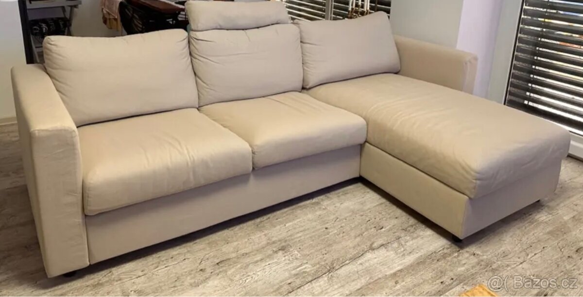 3 místná pohovka s lenoškou VIMLE z Ikea, potah Hallarp béžový, pod lenoškou úložný prostor, potah je odnímatelný a pratelný, není rozkládací, lenošku lze přehodit i na druhou stranu, je k tomu přizpůsobená, uvnitř dírky z obou stran k přimontování, v pěkném stavu, čistá