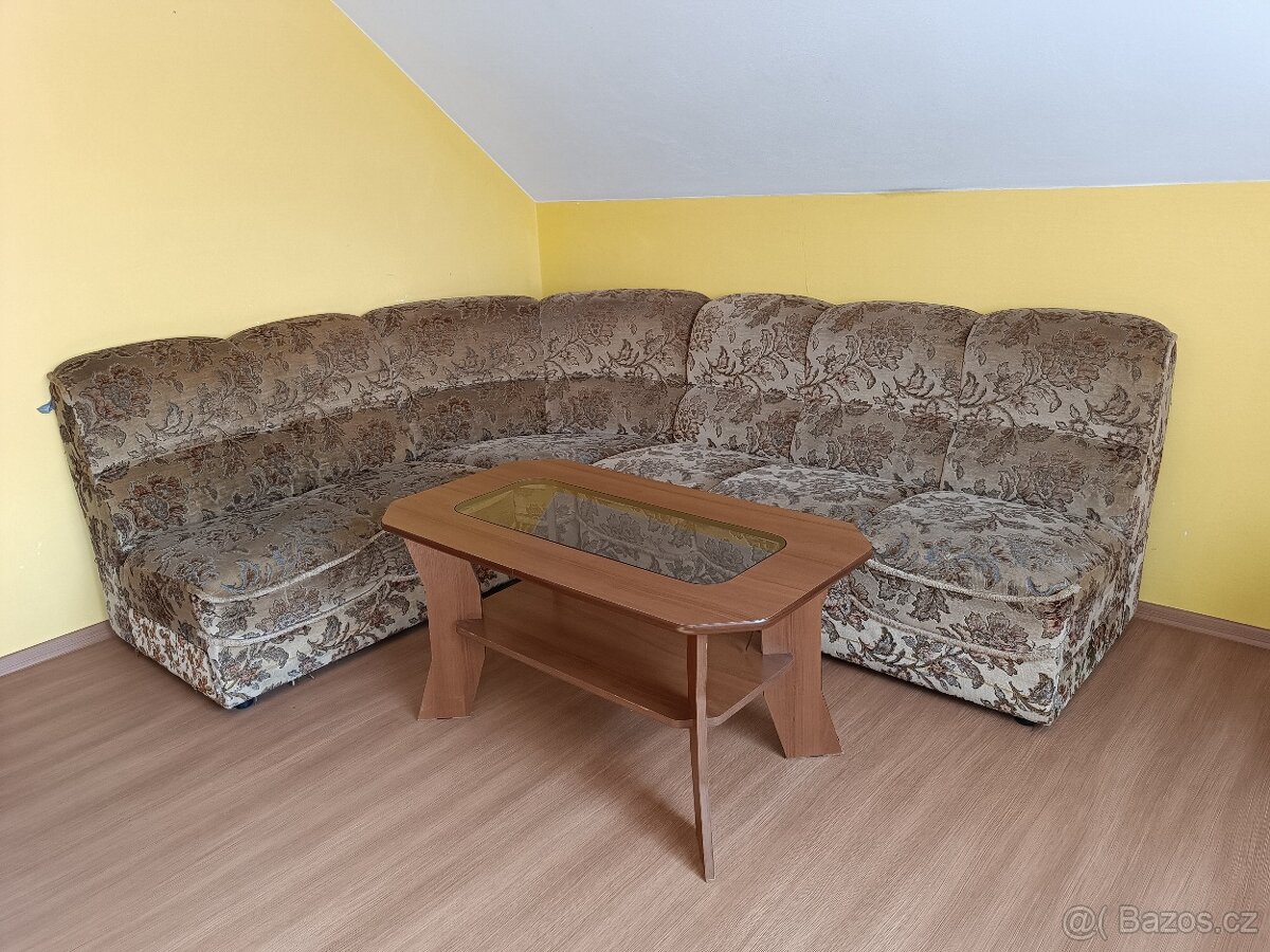 Prodám starší rohovou sedací soupravu. Výška 90cm, šířka 250x200cm, hloubka 85cm. Při rychlém jednání stolek zdarma! Pouze osobní odběr v Telči.