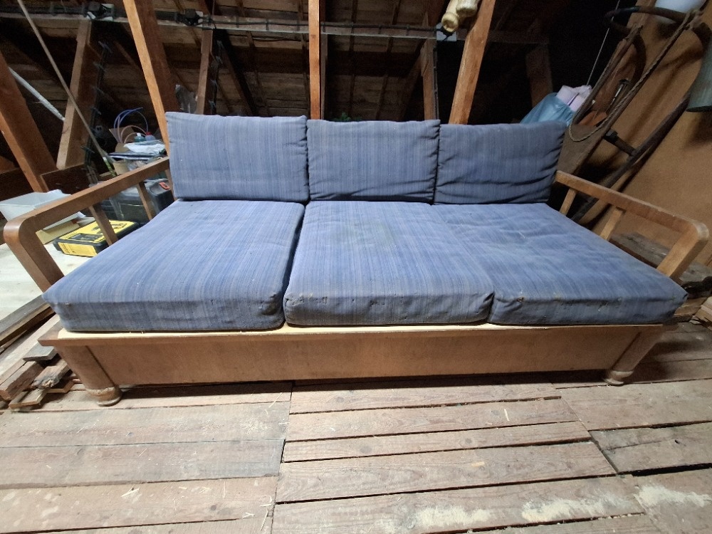 prodám historický (40. léta) masivní dřevěnou pohovku/gauč s úložným prostorem, drátěný rošt, matrace