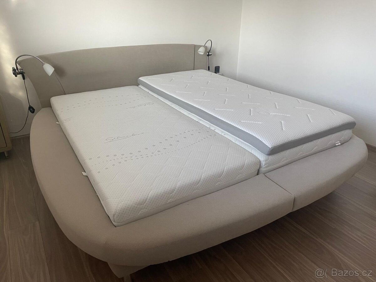 Prodám manželskou postel včetně pružinových matraci a paměťové vrstvy . Postel je ve světle šedé barvě a omyvatelné látce nanoflok . Postel má úložný prostor . Noční lampičky jsou součástí postele . Německá výrobce . Pouze osobní odběr a platba .