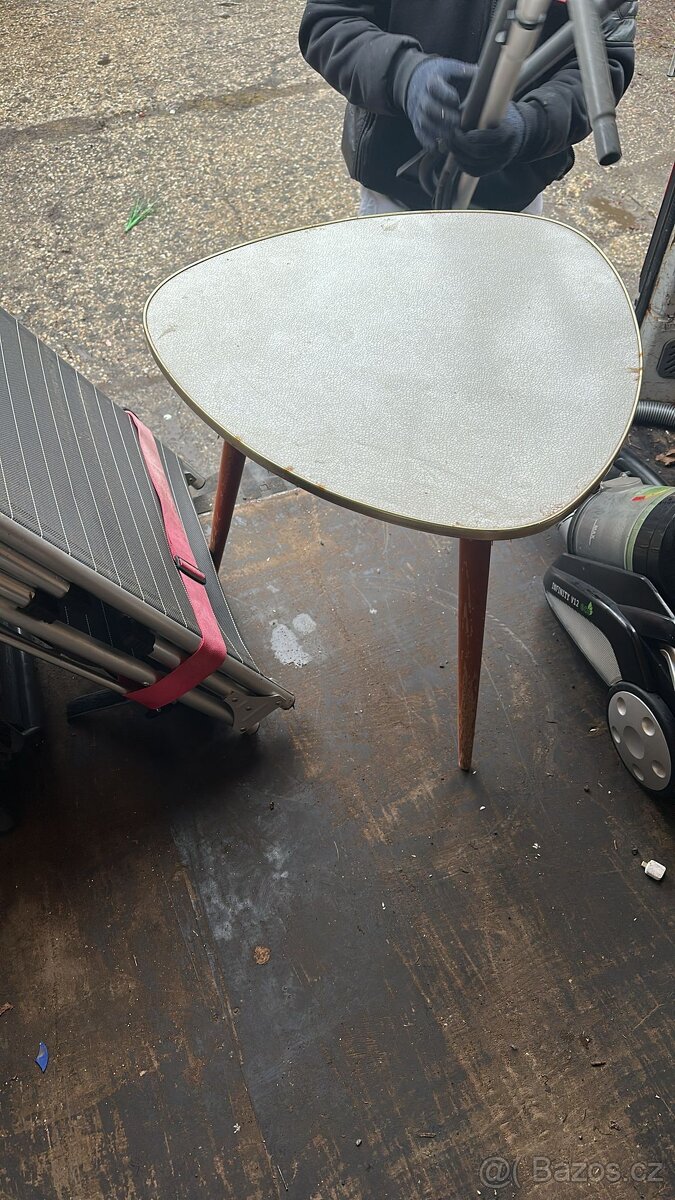 Stolek Brusel - [28.2. 2026]Retro stolek Brusel. Svetla Modra barva. Drevo & umakart.