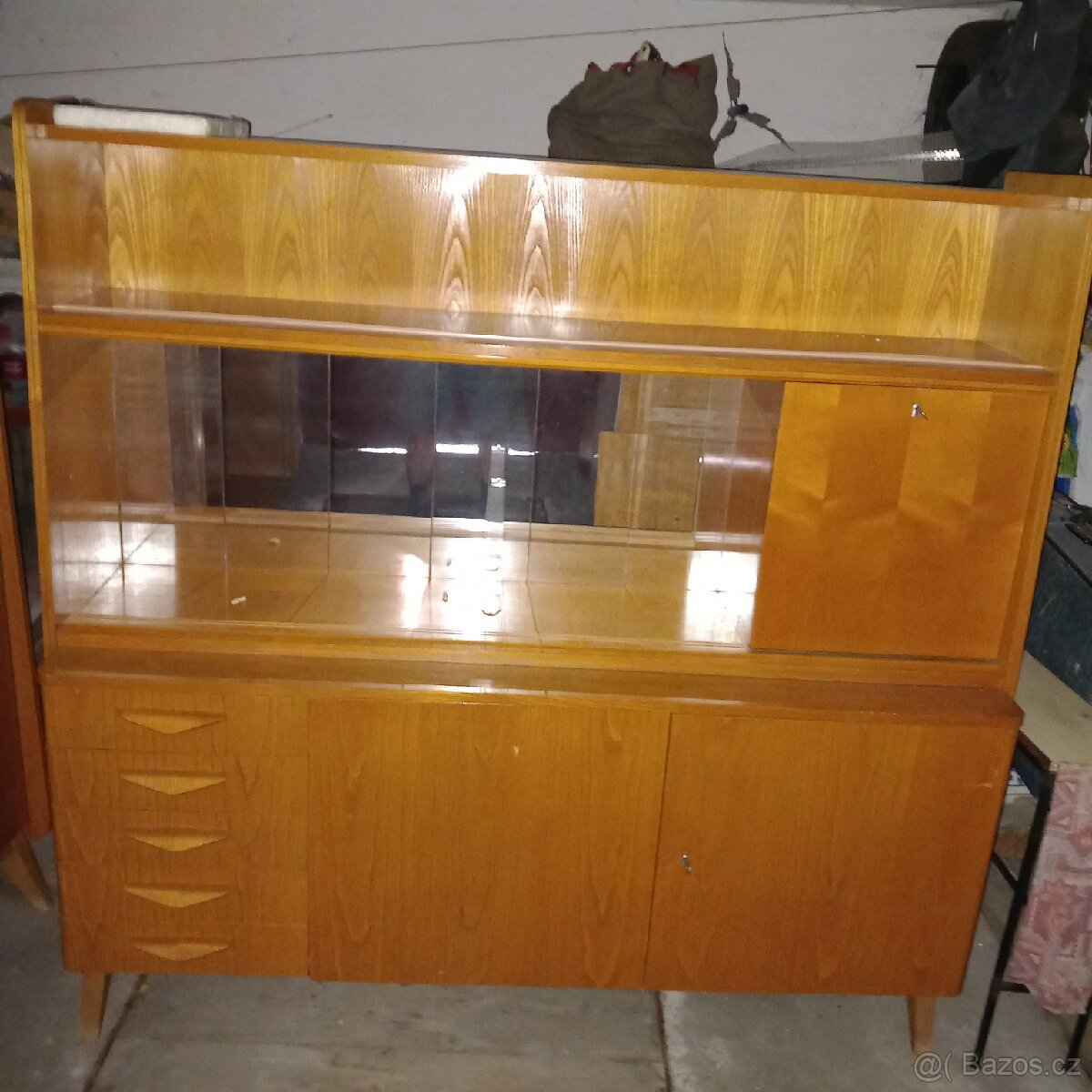 Starší obývací stěna – kořenová dýha - [26.4. 2026]Nabízím starší obývací stěnu ve stylu art deco / retro z kořenové dýhy. Skříň má několik oděrek, ryh a známek používání, povrch není v původně reprezentativním stavu, takže je spíš vhodná pro nenáročné použití, na chatu nebo k případné renovaci. Otev ...