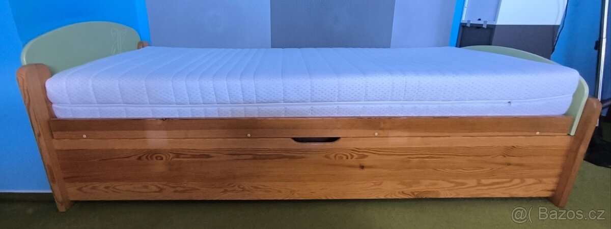 Dětská postel, hodně bytelná, po jednom dítěti. Úložný prostor. Rozměry postele celkem 101x211, rozměry matrace 90x200. Možné dodat i s novou matrací zdarma.