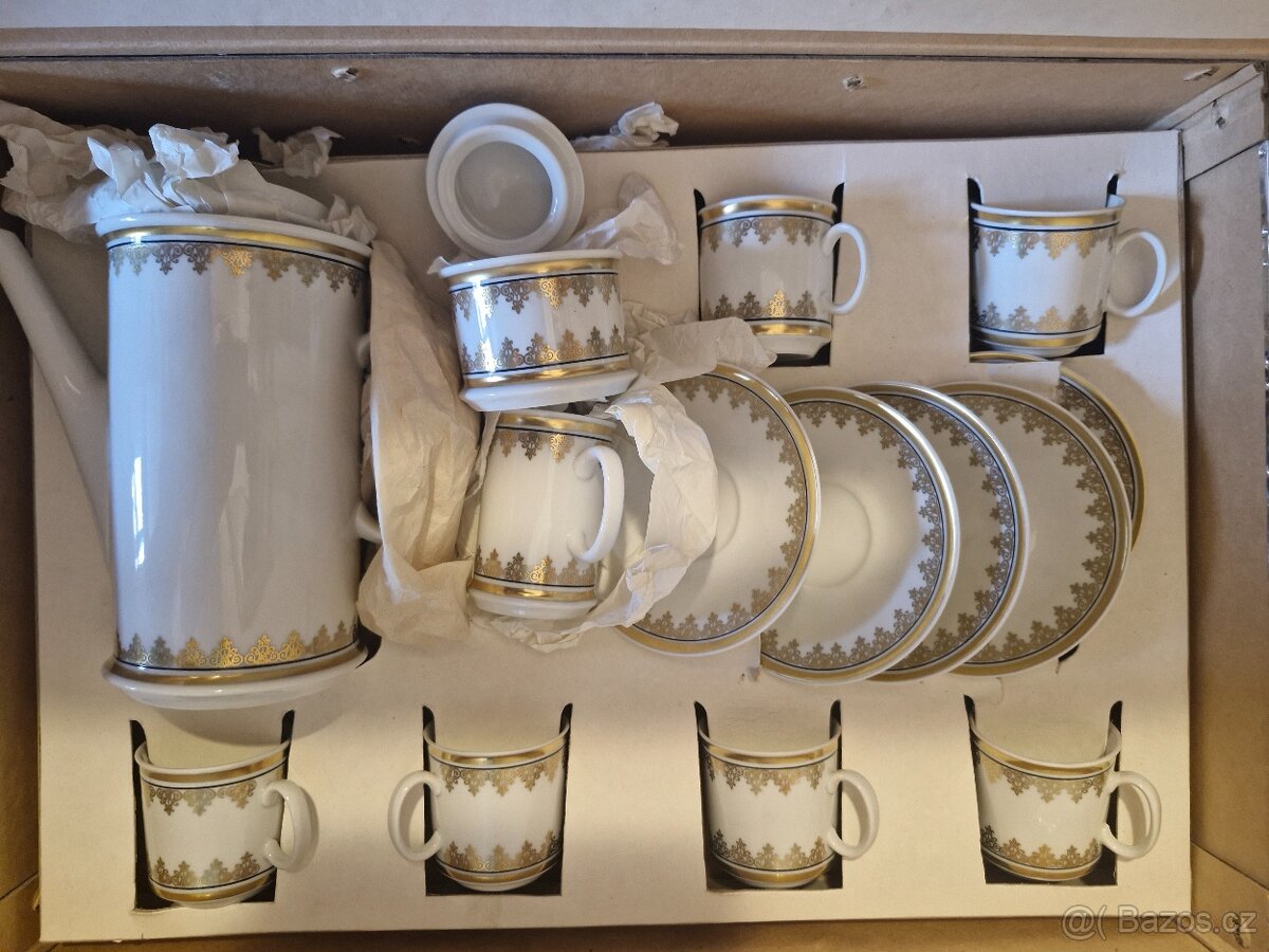 Souprava je vyrobena z glazovaného porcelánu a zdobena zlatým ornamentem.