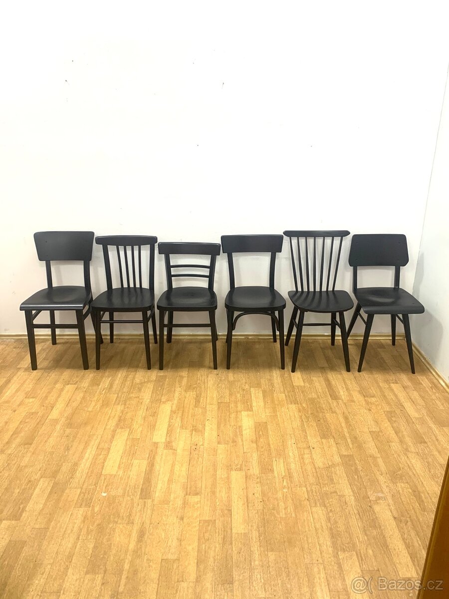 Prodávám sadu šesti legendárních retro židlí, výroba ČSSR 60. léta TON Bystřice pod Hostýnem, dřevěná konstrukce, elegantní nadčasový design, každá je jiná a přece k sobě ladí. Velmi dobrý stav, konstrukce pevná, dřevo zdravé, ponechány v původním stavu s drobnými oděrkami pro zachování autenticity, opatřeny sametově matnou černou barvou pro moderní vzhled. Cena 6800,-Kč za 6 židlí, možnost dopravy,
