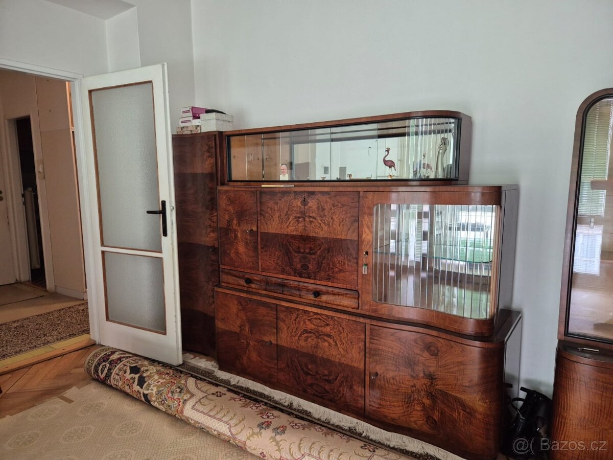 K dispozici sekretář / příborník se skříní (může stát zvlášť), knihovna, rozkládací gauč, rozkládací stůl a 4 židle s červeným polstrováním. Vše v jednotné estetice s mírným obloučkem. Klíčky a kování, vnitřní poličky atd. k disppozici. Vše v TOP stavu. Vyrobeno koncem 50. let.