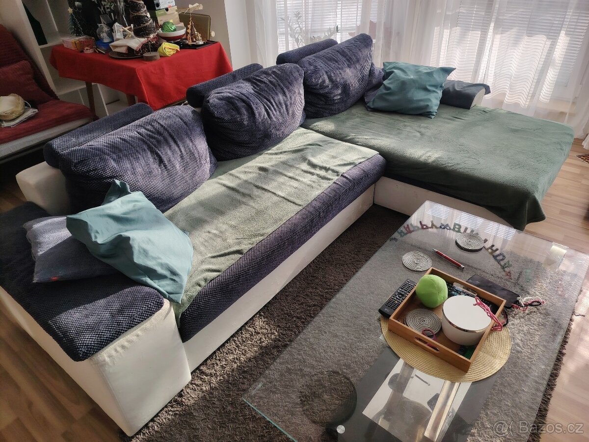 Rohová sedací souprava - [1.3. 2026]Prodám rohovou sedačku. Běžné opotřebení. Parádu ještě udělá. Je rozkládací a má úložný prostor.
