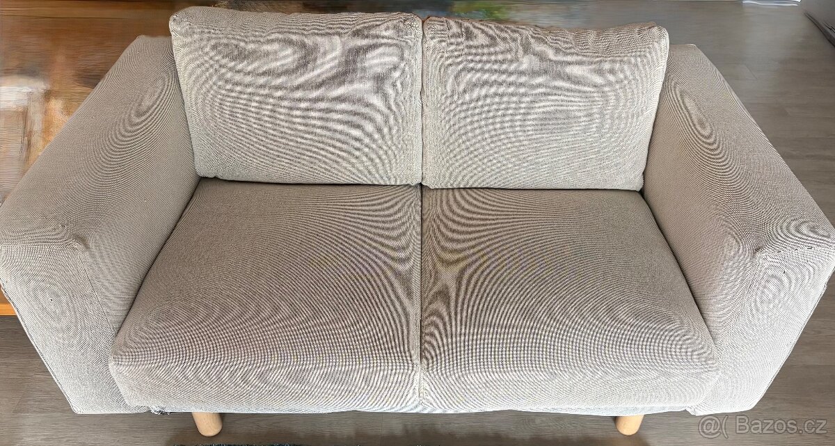 Dvoumístná pohovka Norsberg (Ikea) s šedým potahem, velmi pohodlná, korpus, polštáře jako nové, potah čistý, pouze kosmetické vady, vytahané nitky. Cena odpovídá stavu.