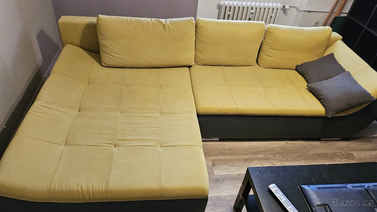 Sedací souprava olivové barvy. Zádovou opěrku lze sklopit a vytvořit tak dvoulůžko. Na několika místech odřená koženka (opěrka na ruce - viz foto, místy spodní část pod sezením). Nicméně jinak stále v pěkném stavu a pohodlná. Odvoz v Brně z Renneské třídy.