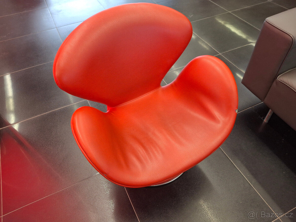 Designové křeslo v červené eko kůži. Kosmetické vady. Křesla jsou z hotelového lobby.