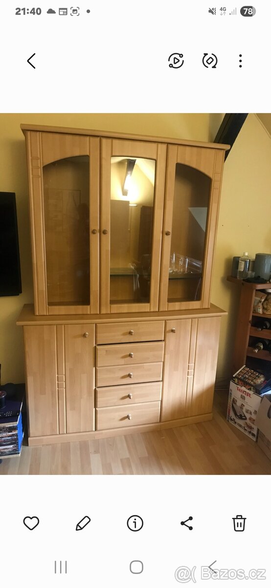 Starší obývací stěna – kořenová dýha - [26.4. 2026]Nabízím starší obývací stěnu ve stylu art deco / retro z kořenové dýhy. Skříň má několik oděrek, ryh a známek používání, povrch není v původně reprezentativním stavu, takže je spíš vhodná pro nenáročné použití, na chatu nebo k případné renovaci. Otev ...