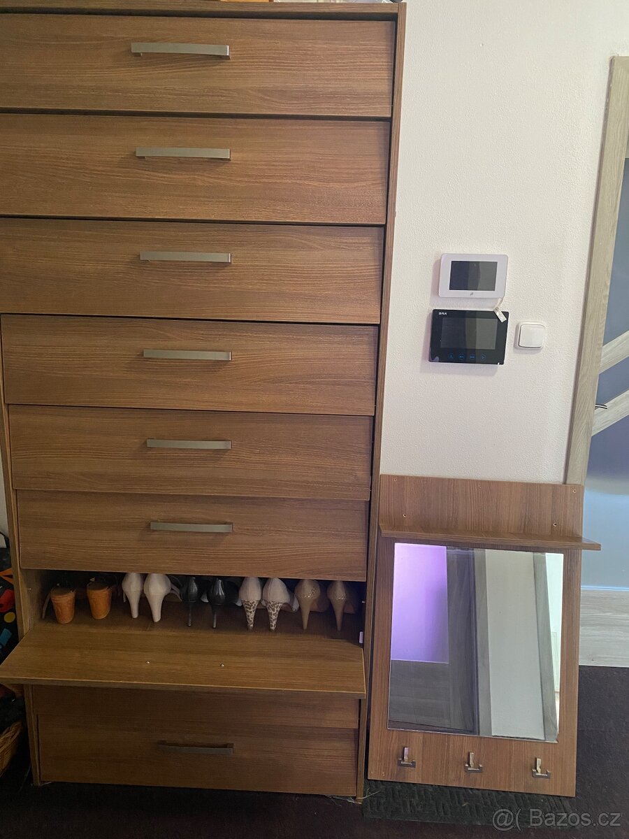 Botník vysoký 2m Široký 90 cm hloubka 36 cm 9 krát police na 45 párů bot. Zrcadlo délja90cm šířka 60 s poličkou a háčky . Důvod prodeje stěhování velká sleva!
