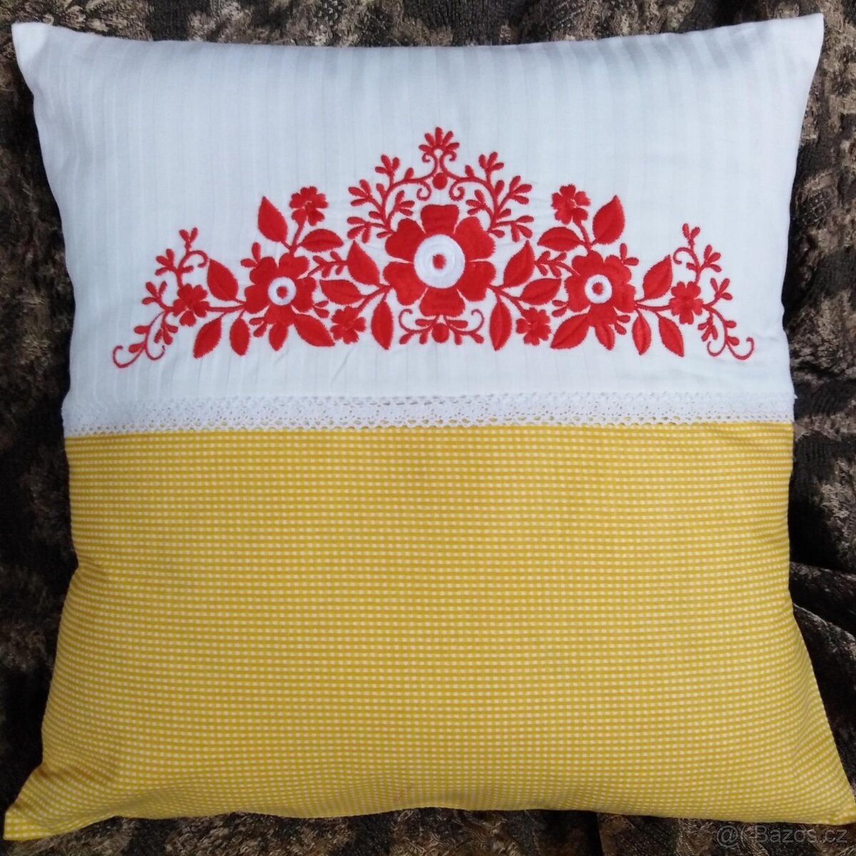 PRODÁVÁM VYŠÍVANÝ POVLAK NA POLŠTÁŘEK - 40cm x 40cm, BAVLNA, DOMÁCÍ VÝROBY. VYŠÍVACÍ NITĚ - ČERVENÁ.PRAKTICKÉ HOTELOVÉ ZAPÍNÁNÍ, ŽÁDNÝ ZIP ANI KNOFLÍKY. KRÁSNÁ DEKORACE DO KUCHYNĚ - JÍDELNY. DĚKUJI.